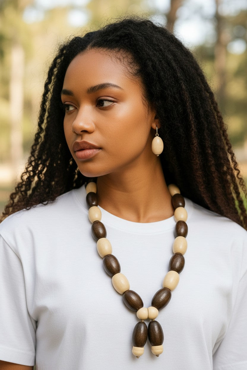 Necklace Earring 2 Pc. Set | Unique Design Handmade by Lillie Pearl | A Stretchy Over-The-Head 28” Strand of Natural Unfinished 1” Long | 14mm Thick Wooden Barrels | Simultaneously Sharing The Stretchy Strand with Polished Briar Wood Barrels, also 1” Long and 14mm Thick Creating This Exquisite HIS or HERS Ethnic 2 Pc. Necklace Earring Set. Double Dropped Briar Wood Barrels Settle Side-By-Side into the Unique Pendant | Each Barrel Completed by A Natural Unfinished Carved 12mm Wooden Barrel. Matching Natural Unfinished Wooden Barrel 2” Dangler Earrings Create a 1-of-A-Kind Design You Won’t See Anywhere Else. 4.5 oz. Total Weight | Unisex & Suitable for Adults or Teens